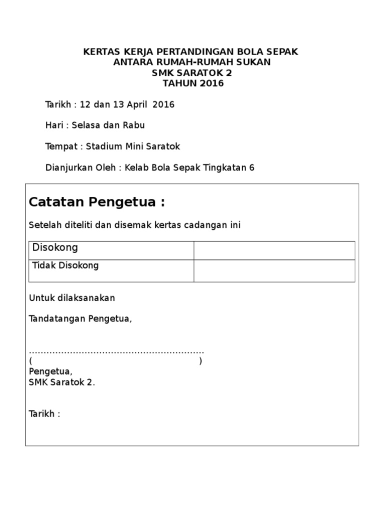 Save Save Kertas Kerja Program Pembangunan Bola. Hari Jenis Aktiviti Pengelola Isnin 500 630 pm Aktiviti Kecerdasan Fizikal Latihan di Jurulatih Padang Teori Taktikal Latihan Kecergasan Fizikal. View Kertas kerja pertandangan bola sepakpptx from ENGL ENGLISH CO at University of Maryland University College.